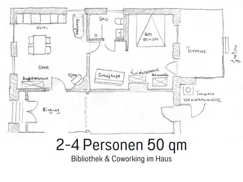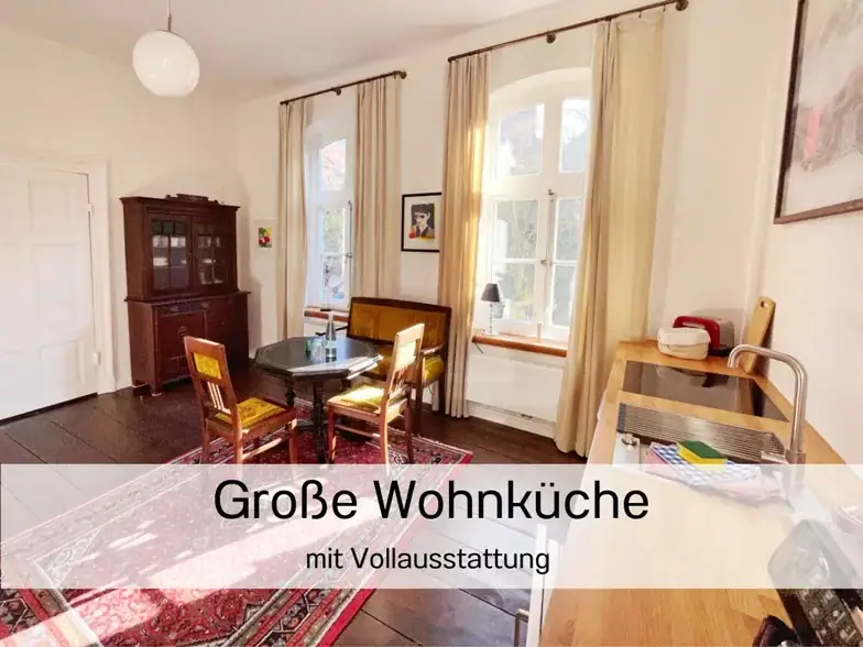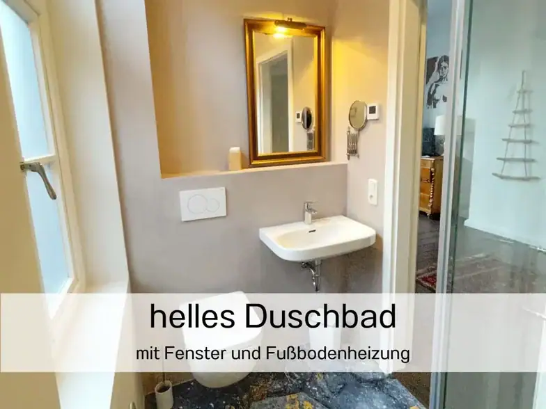 Das Apartment Ebbe zeichnet sich durch Ost-Süd-West Lage aus in der vormittags die Sonne heimelig in den Ess- und Wohnbereich scheint. Nachmittags erhellt sie den Schlaf- und Wohnbereich und lädt zum Verweilen auf der geschützten Terrasse zum großen Garten hin ein. Besonders ist auch das moderne fugenlose Duschbad auf dessen Boden die Impression des Strandufers während der Ebbe bei Ostbense eingearbeitet wurde. Das Bad hat ein Fenster und Fußbodenheizung. Bei der Sanierung haben wir Wert darauf gelegt, Wand-, Decken- und Bodenflächen ökologisch, historisch und nachhaltig zu bearbeiten. Die Ebbe hat einen geräumigen Schlafbereich in dem ein ausklappbares Sofa steht, was einer weiteren Person oder aber auch zwei Kindern eine Schlafmöglichkeit bietet. Der gemütliche Wohnküche verfügt über antikes Mobiliar und ist voll ausgestattet. In eigens erstellte Küchenzeile wurde eine Spülmaschine integriert, den historischen Ofen in der Küche haben wir erhalten.