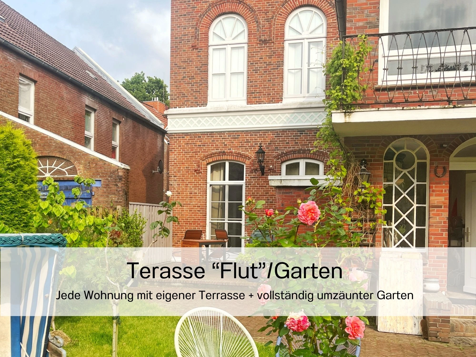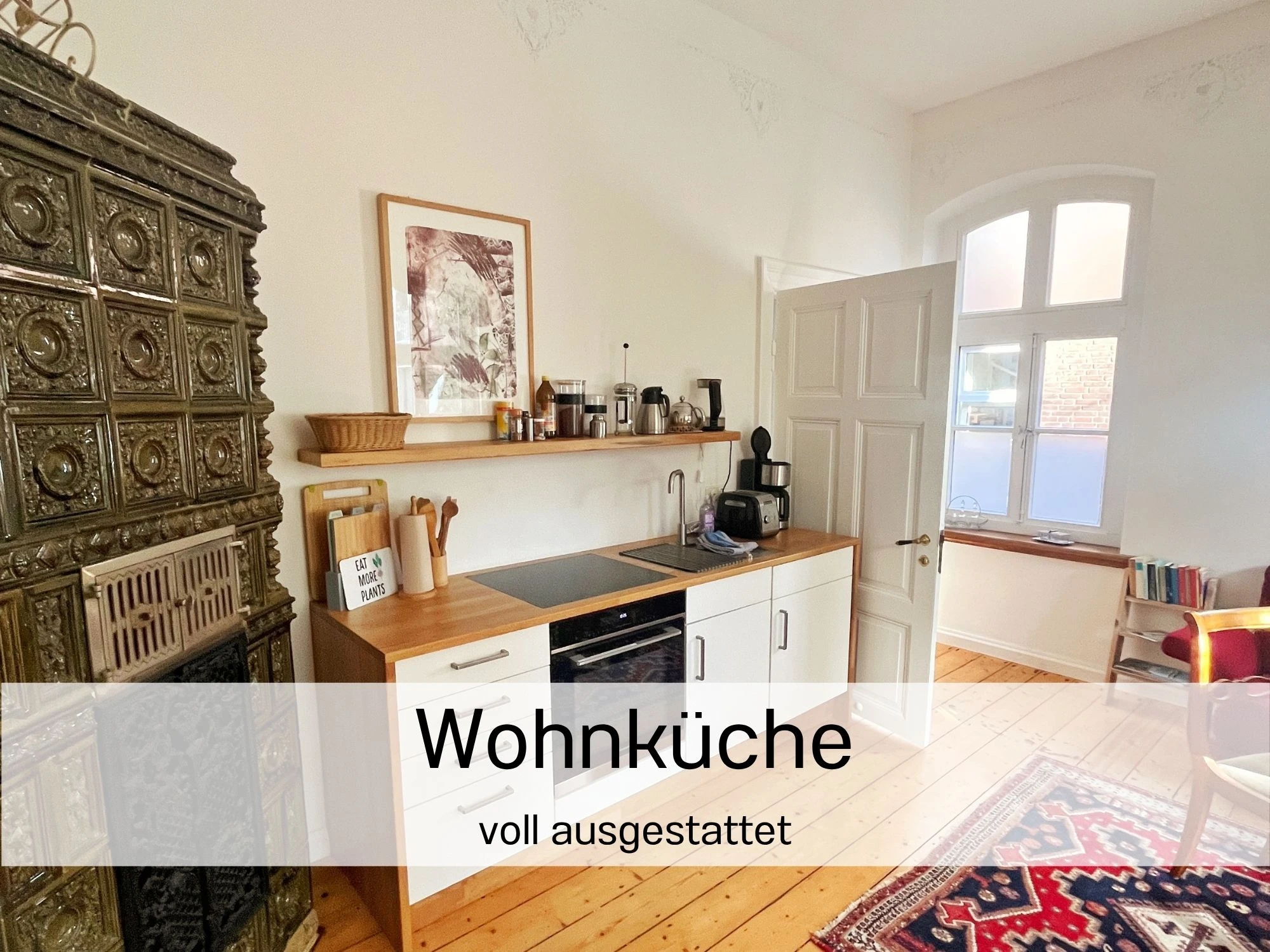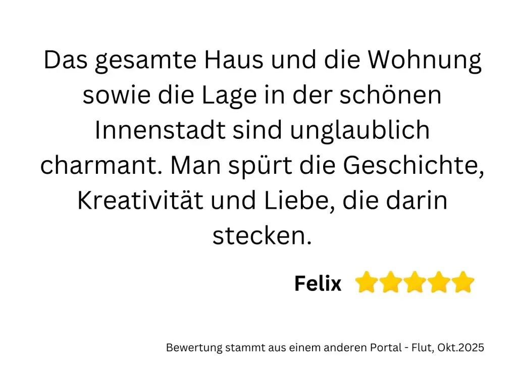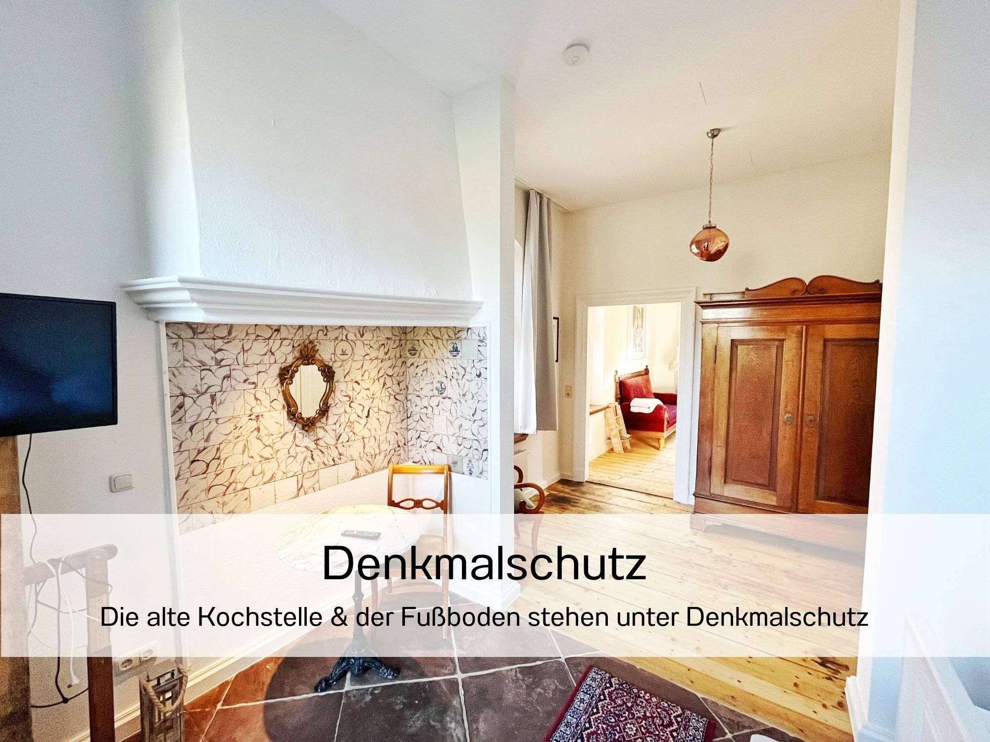 Das Apartment Flut ist optimal für zwei Personen geeignet. Besonders ist, dass im Wohn- und Essbereich der 160 Jahre alte denkmalgeschützte Kachelofen die Atmosphäre historisch anmuten lässt. Im Schlafbereich sind der alte Sandsteinboden (Bremer Floren) und die alte Feuerstelle (Esse) liebevoll und originalgetreu restauriert worden. Im Wohnbereich sind zudem die pompeianische Schablonenmalerei, die ca. 2005 vom Künstler Cyrus Overbeck ausgeführt wurden und bei der Sanierung der Wandflächen weitestgehend erhalten geblieben. Diese wurden mit einer Silikatlasur überarbeitet. Der Kleiderschrank im Schlafbereich ist ein Original der Familie Becker aus der Biedermeierzeit, der vom Sperrmüll gerettet, überarbeitet und von uns ins Haus zurück geholt wurde. Der alte Dielenboden weist an vielen Stellen dunkle Flecken auf. Diese stammen von den künstlerischen Arbeiten des Vorbesitzers Cyrus Overbeck, dessen Druckmaschine in diesen Räumlichkeiten stand, um Lithografien, Drucke und andere Kunstwerke herzustellen. Seine Werke sind im ganzen Haus verteilt wiederzufinden. Wie auch die andere Ferienwohnung hat die Flut eine geschützte Terrasse zum großen Garten. Sie lädt zum Verweilen in der Abendsonne ein.