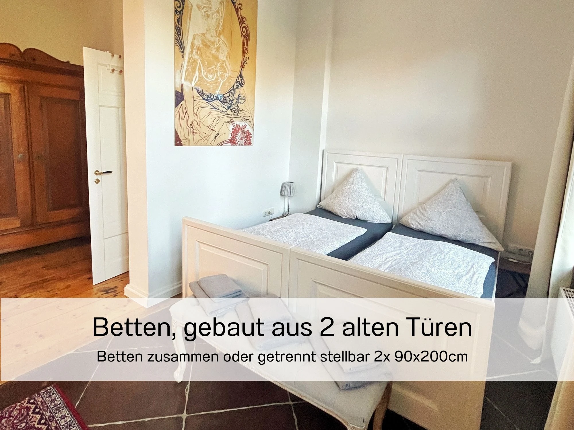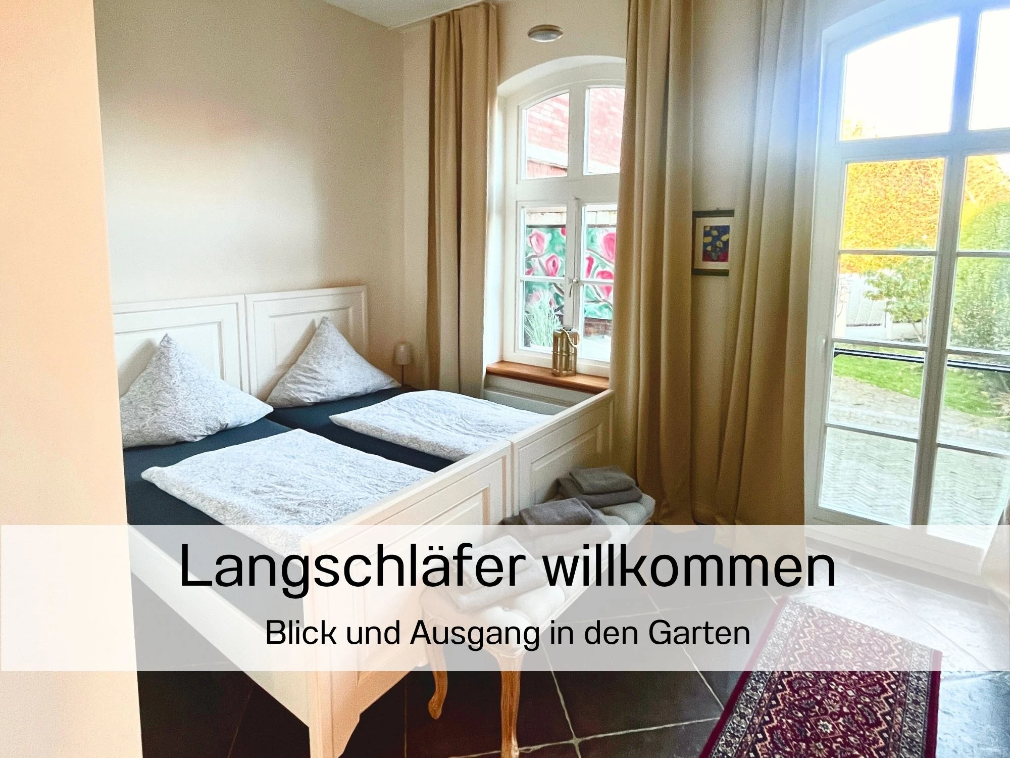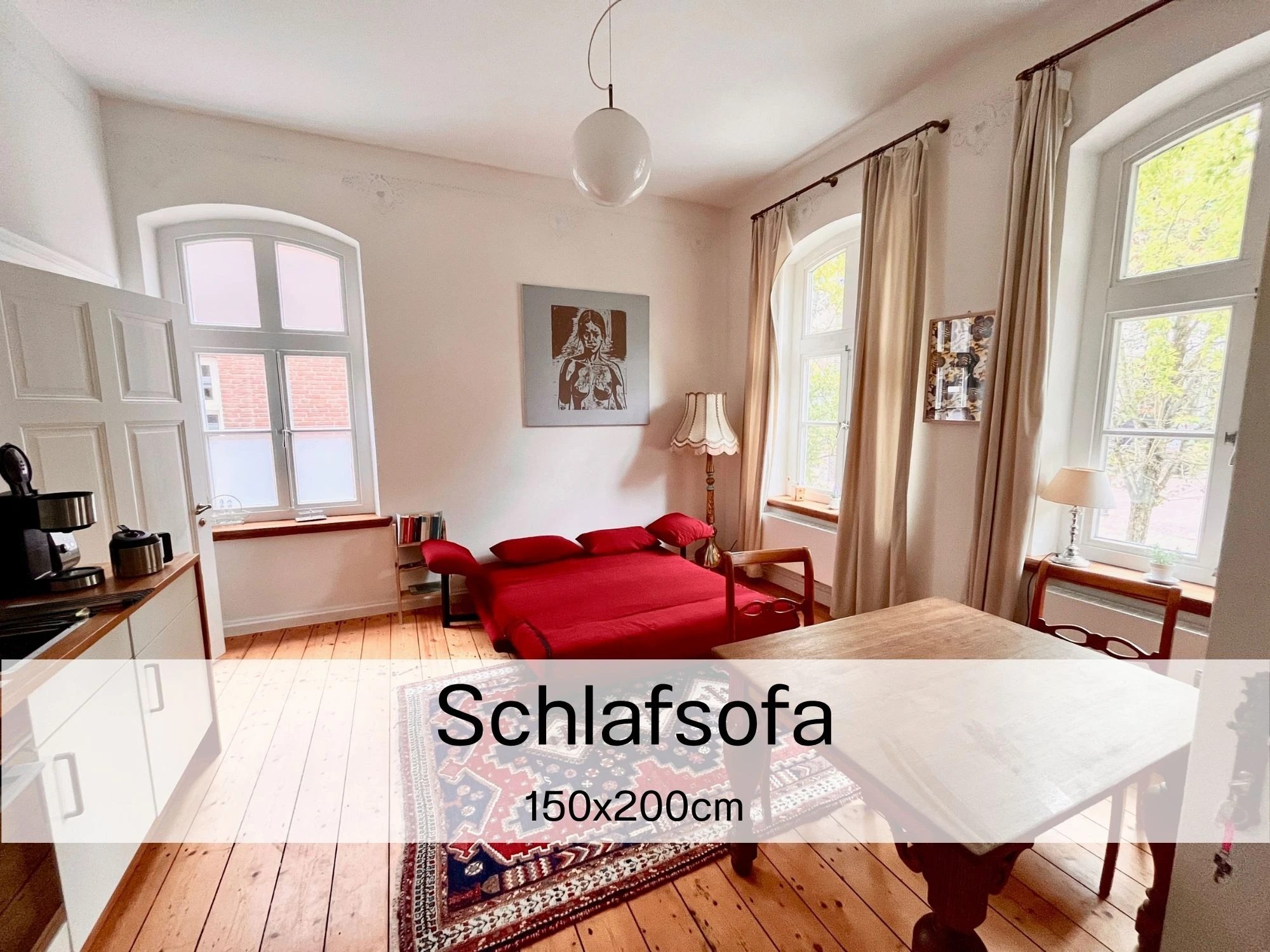 Das Apartment Flut ist optimal für zwei Personen geeignet. Besonders ist, dass im Wohn- und Essbereich der 160 Jahre alte denkmalgeschützte Kachelofen die Atmosphäre historisch anmuten lässt. Im Schlafbereich sind der alte Sandsteinboden (Bremer Floren) und die alte Feuerstelle (Esse) liebevoll und originalgetreu restauriert worden. Im Wohnbereich sind zudem die pompeianische Schablonenmalerei, die ca. 2005 vom Künstler Cyrus Overbeck ausgeführt wurden und bei der Sanierung der Wandflächen weitestgehend erhalten geblieben. Diese wurden mit einer Silikatlasur überarbeitet. Der Kleiderschrank im Schlafbereich ist ein Original der Familie Becker aus der Biedermeierzeit, der vom Sperrmüll gerettet, überarbeitet und von uns ins Haus zurück geholt wurde. Der alte Dielenboden weist an vielen Stellen dunkle Flecken auf. Diese stammen von den künstlerischen Arbeiten des Vorbesitzers Cyrus Overbeck, dessen Druckmaschine in diesen Räumlichkeiten stand, um Lithografien, Drucke und andere Kunstwerke herzustellen. Seine Werke sind im ganzen Haus verteilt wiederzufinden. Wie auch die andere Ferienwohnung hat die Flut eine geschützte Terrasse zum großen Garten. Sie lädt zum Verweilen in der Abendsonne ein.