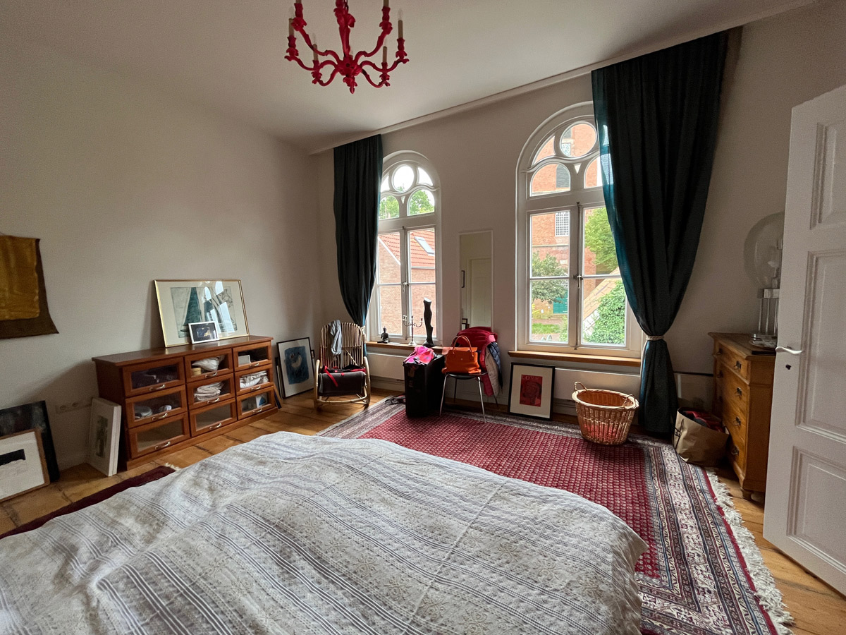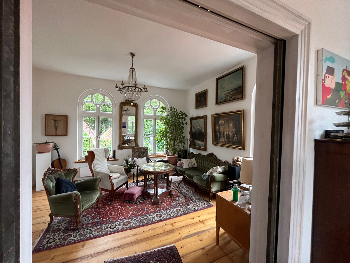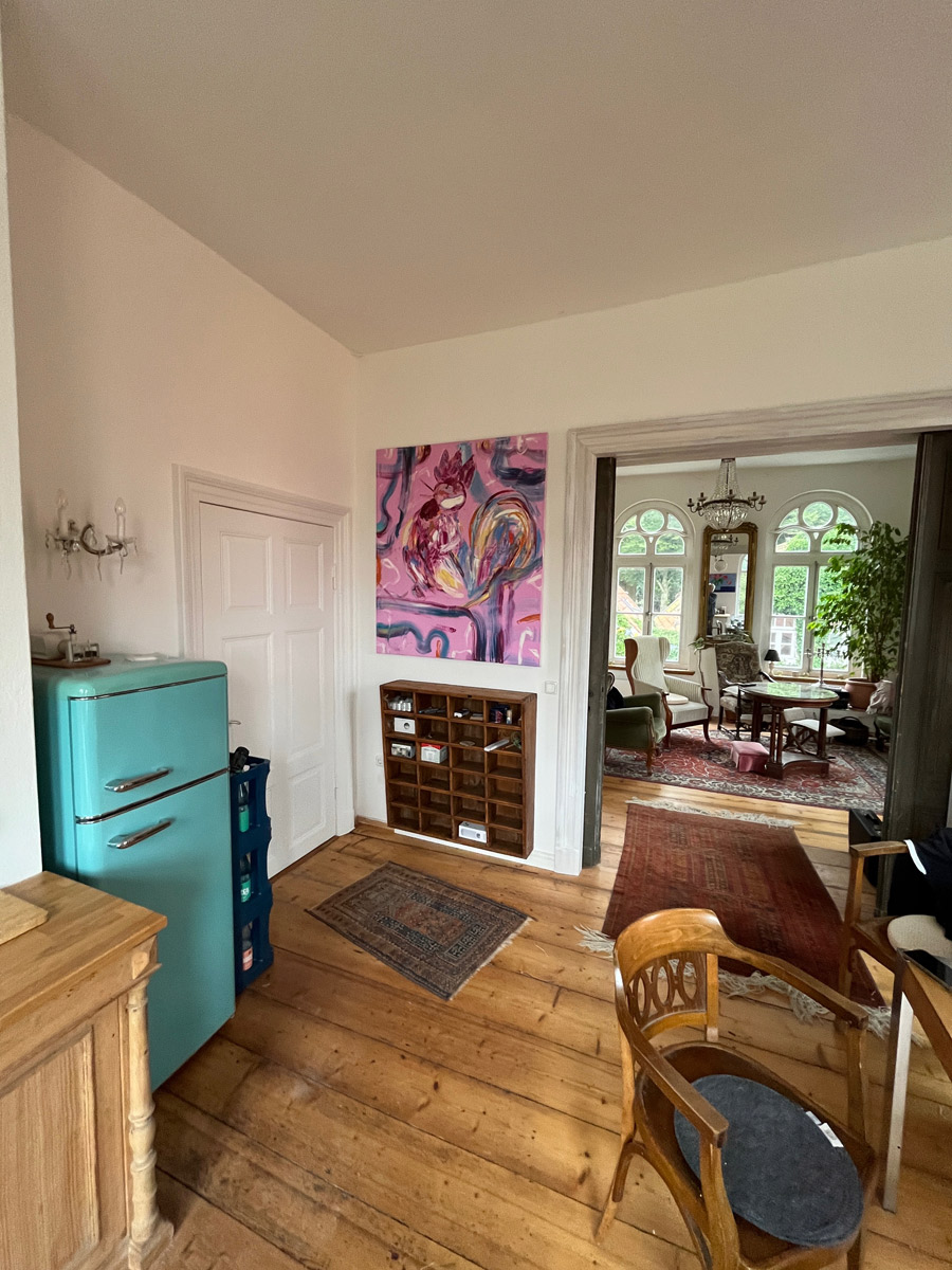 Im ersten Stock des Becker-Hauses befindet sich großzügige ca. 120 qm2 große „Künstlerwohnung“, die ihren Namen dadurch erhielt, dass dies vom Künstler hauptsächlich bewohnte Bereich war und als Ort verschiedener Kunstevents diente. So fanden hier vor allem Konzerte, Workshops, Lesungen und Ausstellungen statt. Hier traf sich die kunstinteressierte Community aus verschiedenen Teilen Deutschlands und der Welt, hier wurde diskutiert, musiziert, hier entstanden Ideen und wurden Verhandlungen geführt. Die gesamte Wohnung wurde von uns saniert und restauriert. Das 70ziger Jahre Bad wurde abgerissen und statt dessen ein großer Wohn- Essbereich geschaffen, der mit einer original-historischen Schiebetür geteilt werden kann. Das Atelier des Künstlers wurde zum Kinder-/ Gästezimmer das ruhig zum Garten gelegen und einem eigenen Duschbad ausgestattet ist. Den Salon haben wir als großzügigen Schlafraum mit einem fugenlosen Masterbad umfunktioniert. Die alten Dielenböden wurden durchgängig aufgearbeitet und neu versiegelt. Besonders sind die historischen hohen Fenster die von uns, sofern nicht vorhanden, nachgebaut wurden. Viele Einzelelemente der ursprünglichen Künstlerwohnung wie Einrichtung des Wohnzimmers oder Bilder haben wir erhalten. In der großzügigen Künstlerwohnung ist heute noch der Geist des Philosophierens, Musizierens oder gemütlich beieinander Seins zu spüren. Eine ganz besondere Atmosphäre vor allem, wenn das Licht die Räume hell und warm durchflutet.