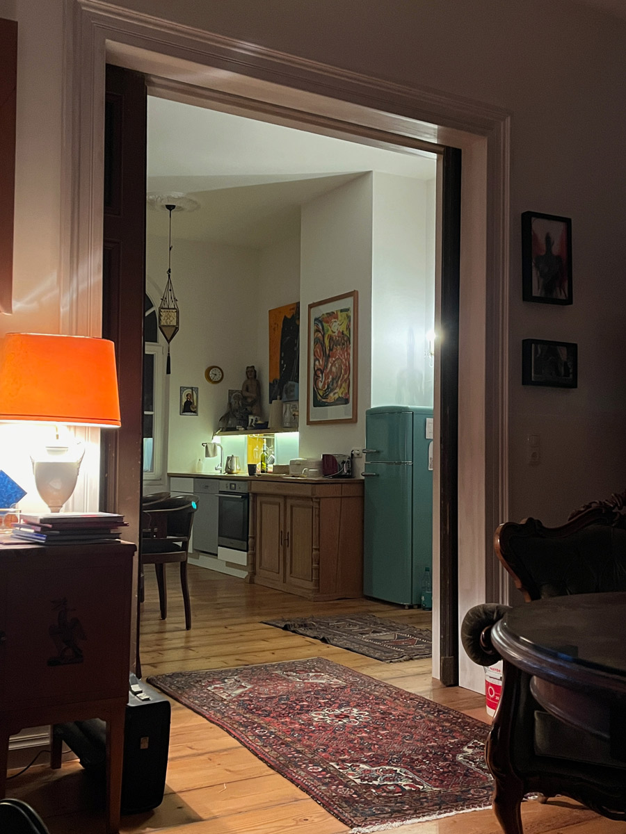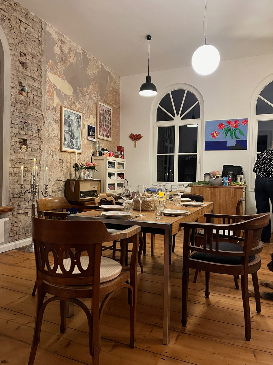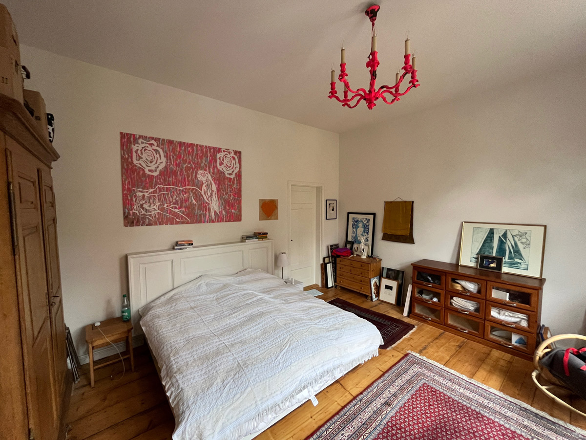 Im ersten Stock des Becker-Hauses befindet sich großzügige ca. 120 qm2 große „Künstlerwohnung“, die ihren Namen dadurch erhielt, dass dies vom Künstler hauptsächlich bewohnte Bereich war und als Ort verschiedener Kunstevents diente. So fanden hier vor allem Konzerte, Workshops, Lesungen und Ausstellungen statt. Hier traf sich die kunstinteressierte Community aus verschiedenen Teilen Deutschlands und der Welt, hier wurde diskutiert, musiziert, hier entstanden Ideen und wurden Verhandlungen geführt. Die gesamte Wohnung wurde von uns saniert und restauriert. Das 70ziger Jahre Bad wurde abgerissen und statt dessen ein großer Wohn- Essbereich geschaffen, der mit einer original-historischen Schiebetür geteilt werden kann. Das Atelier des Künstlers wurde zum Kinder-/ Gästezimmer das ruhig zum Garten gelegen und einem eigenen Duschbad ausgestattet ist. Den Salon haben wir als großzügigen Schlafraum mit einem fugenlosen Masterbad umfunktioniert. Die alten Dielenböden wurden durchgängig aufgearbeitet und neu versiegelt. Besonders sind die historischen hohen Fenster die von uns, sofern nicht vorhanden, nachgebaut wurden. Viele Einzelelemente der ursprünglichen Künstlerwohnung wie Einrichtung des Wohnzimmers oder Bilder haben wir erhalten. In der großzügigen Künstlerwohnung ist heute noch der Geist des Philosophierens, Musizierens oder gemütlich beieinander Seins zu spüren. Eine ganz besondere Atmosphäre vor allem, wenn das Licht die Räume hell und warm durchflutet.